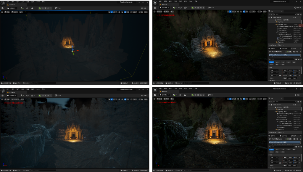Then I began to design the lighting, I used aerosol effect more, hoping that the feeling of gloom can be better. Cool colors are also used outside to contrast with the warm tones of the fire in the entrance. The entrance light just shines on the position of the character’s walking stop, hoping to foretell when the character’s face is close-up before the entrance panoramic shot.